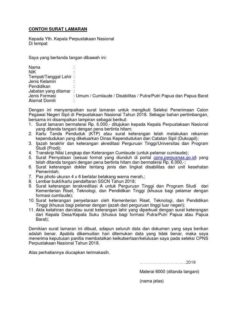 Contoh Surat Lamaran Bermaterai 6 000 ditujukan kepada kepala perpustakaan nasional. Contoh Surat Lamaran Bermaterai Dengan ini menyampaikan surat lamaran untuk mengikuti seleksi penerimaan calon pegawai negeri sipil di perpustakaan nasional tahun 2018. Surat lamaran 2 Ijazah 3 SKCK 4 Kartu kuning 5 Surat Keterangan Kesehatan - - Masuk berkas perseorangan e.