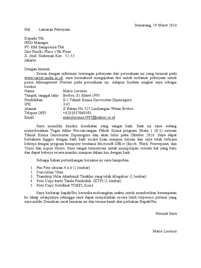 16 Contoh Surat Lamaran Kerja Pt Sampoerna