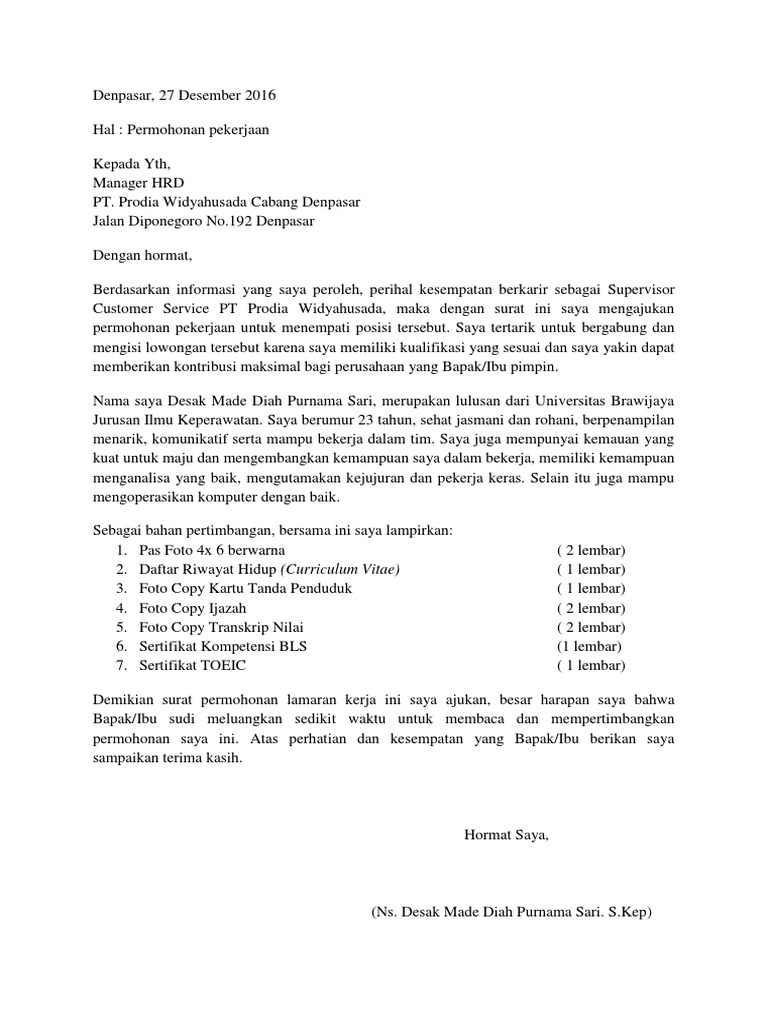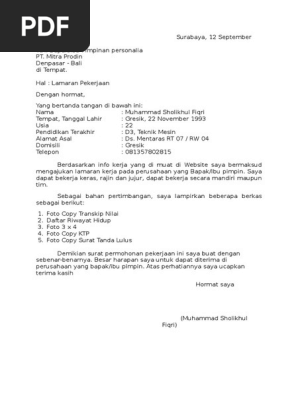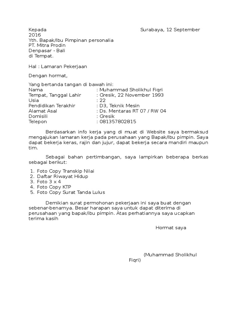 Contoh Surat Lamaran Kerja Di Pt Mitra Prodin