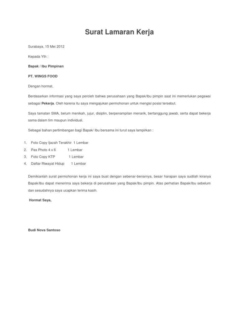 Contoh Surat Lamaran Kerja Di Pt Wings Kumpulan Kerjaan