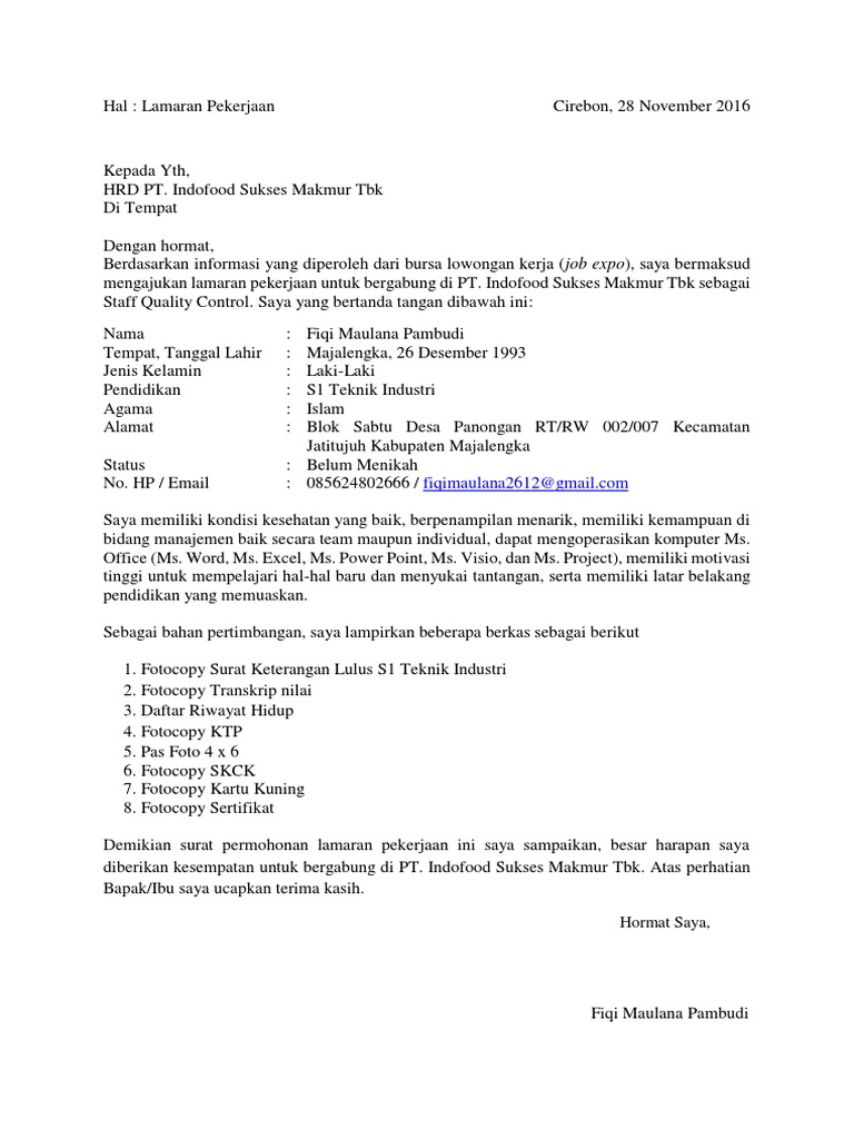 Baik mereka yang baru lulus kuliah S1 atapun mereka yang lulus SMA atau SMK tidak hanya mereka yang fresh graduate yang membutuhkan surat lamaran kerja. Surat lamaran kerja di pt indofood cbp sukses makmur. Tuliskan juga nilai apa yang anda miliki.
