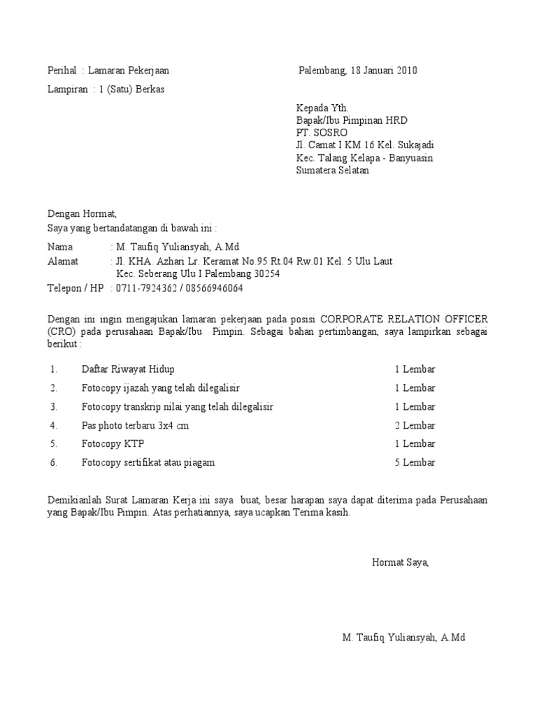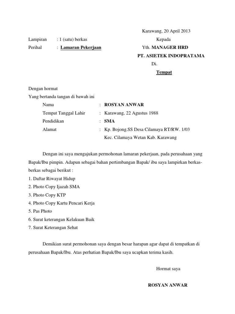 Contoh Surat Lamaran Kerja Yang Baik Dan Benar Lolos Hrd