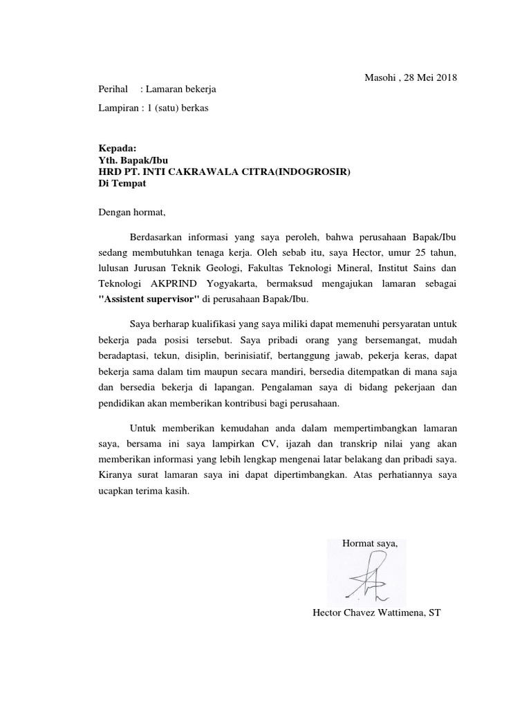 Contoh surat lamaran kerja di indogrosir 12 contoh surat lamaran kerja yang baik dan benar update 2018. Madusila Kelurahan Onduonohu Dengan hormat Berdasarkan informasi yang saya peroleh dari media elektronik Facebook pada tanggal 05 Juli 2018 bahwa perusahaan yang BapakIbu pimpin sedang membutuhkan karyawan di posisi Kasir. Berikut kualifikasinya simak dibawah ini.