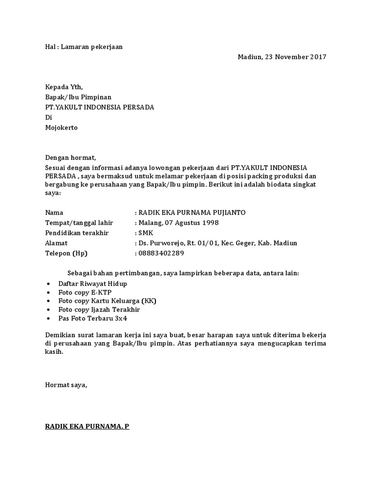 Inilah pembahasan selengkapnya mengenai contoh surat lamaran kerja di pt yakult. Berbagai contoh surat lamaran pekerjaan mulai dari yang baik dan benad perawat rumah sakit bank umum cpns perusahaan pt terbaru dan terlengkap. Rambipuji Kabupaten Jember Jawa Timur 68152 Cp.