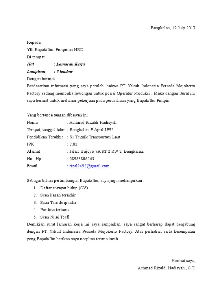 15 Contoh Surat Lamaran Kerja di PT Berbagai Posisi - Setiap orang tentu memiliki kebutuhan yang harus dipenuhi setiap harinya. Lowongan Kerja PT Yakult Indonesia Persada Lowongan Kerja Pasuruan. Surat Lamaran Yakult Izi.