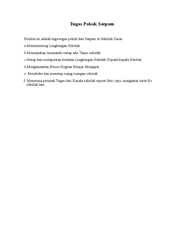 Melakukan tugas belanja makanminum fotocopy mengantar surat dan tugas sejenis lainnya 5. Melaksanakan tugas lain yang diberikan oleh Kepala. Uraian Tugas Penjaga sekolah Satpam a Memelihara dan memperbaiki fasilitas sekolah berupa bangunan kelistrikan dan peralatan praktik.