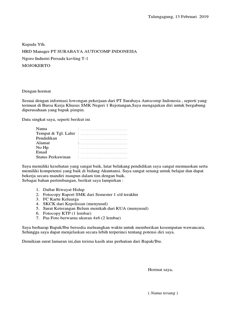 Tempat Dengan hormat Sehubungan dengan informasi yang saya terima dari Media Sosial mengenai lowongan pekerjaan di PT Jasa Raharja maka saya pun memberanikan diri untuk mengajukan lamaran. The collection that consisting of chosen picture and the best amongst others. Contoh surat lamaran kerja umum bank karyawan alfamart pt sekolahan formal fresh graduate bahasa inggris via email tulis surat lamaran kerja dan lampirannya harus menjelaskan.