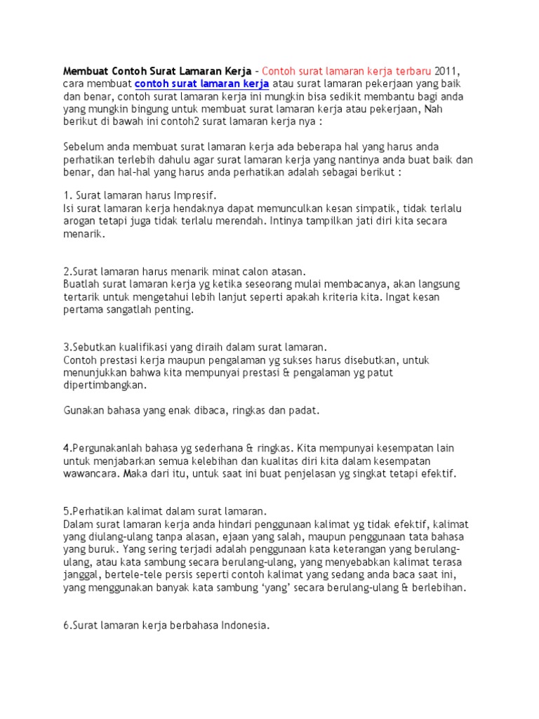 Surat lamaran kerja sebagaimana bentuk surat-surat bisnis yang lain harus dibuat sebaik mungkin dan menarik perhatian bagi pembaca. Bagaimana Cara Membuat dan Contoh Surat Lamaran Kerja yang Baik dan Benar. Surat lamaran diperlukan jika tawaran pekerjaan meminta Anda.