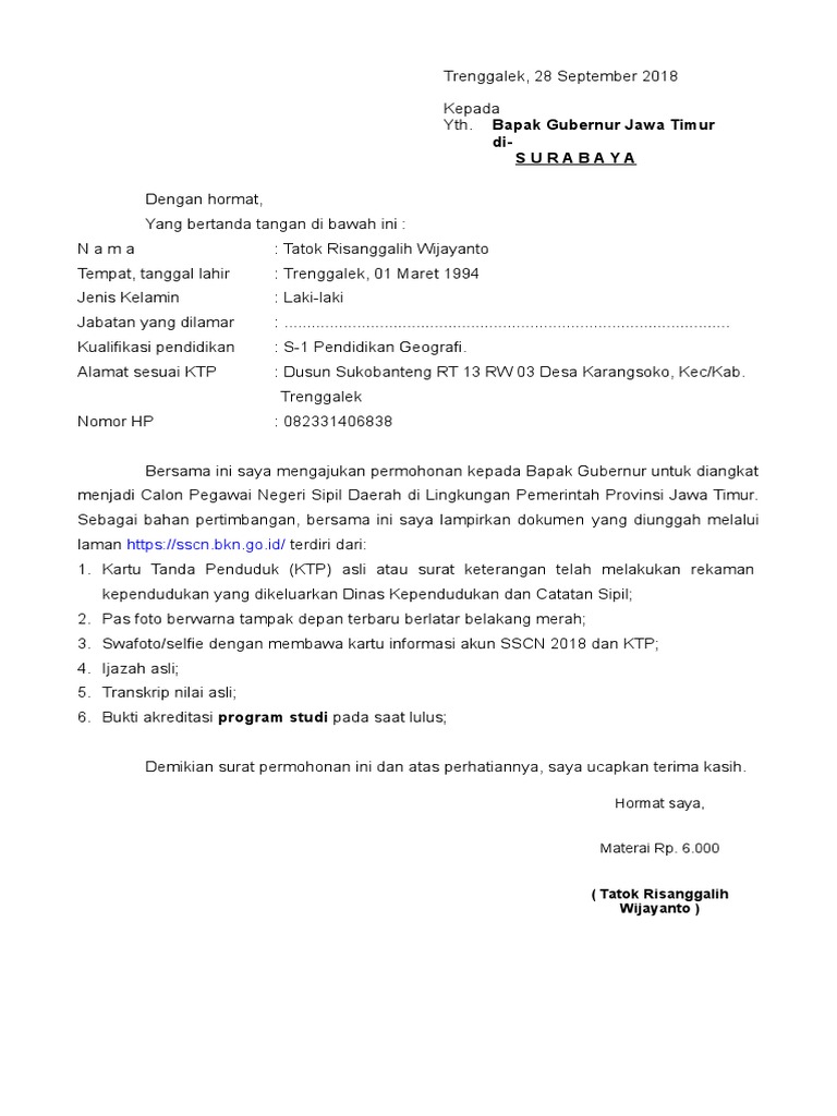 Kami temui surat lamaran yang seharusnya kepada Walikota Yogyakarta malah ditujukan ke Gubernur DIY. Melansir dari laman Facebook BKN RI Pemprov Jatim masih masuk dalam daftar 5 instansi yang paling banyak pelamar. Format Surat Lamaran CPNS 2021 - Petugas memeriksa surat keterangan hasil rapid tes COVID-19 yang ditunjukkan peserta ujian Seleksi Kemampuan Bidang SKB di program penjaringan CPNS 2019 di Tulungagung Jawa Timur Rabu 3092020.