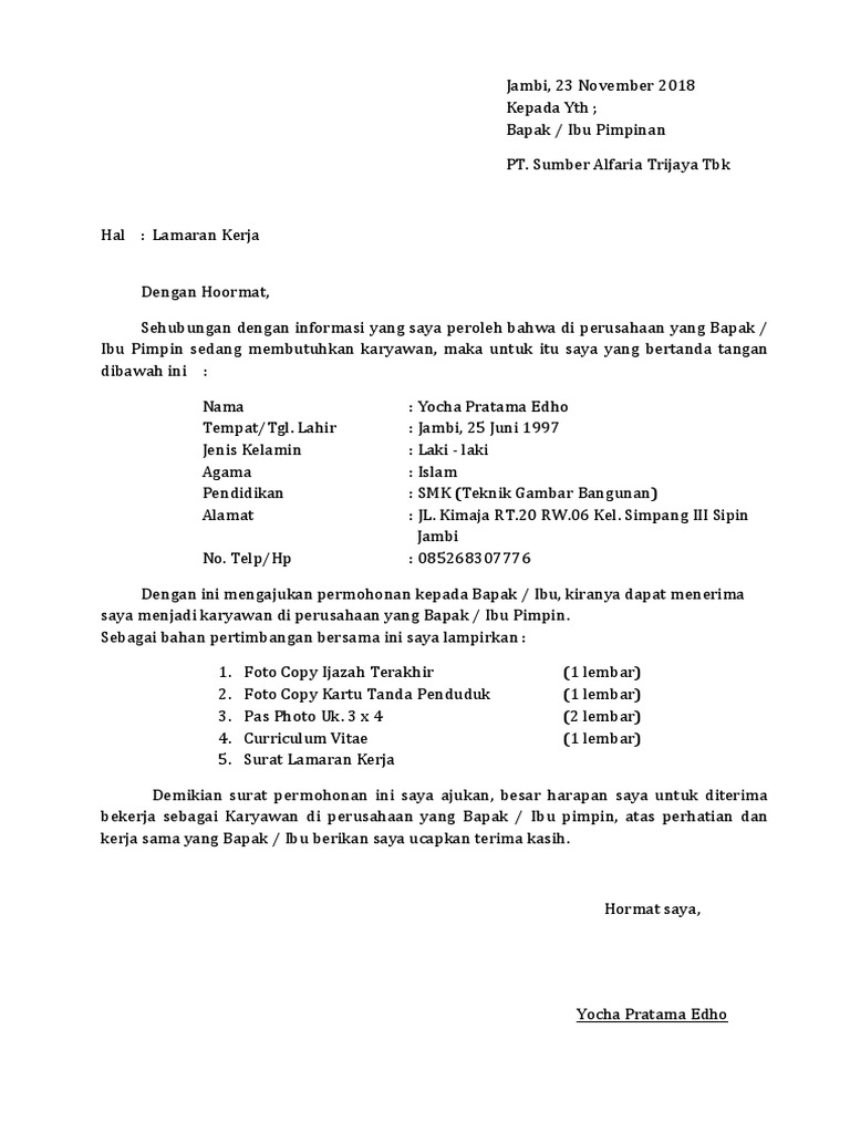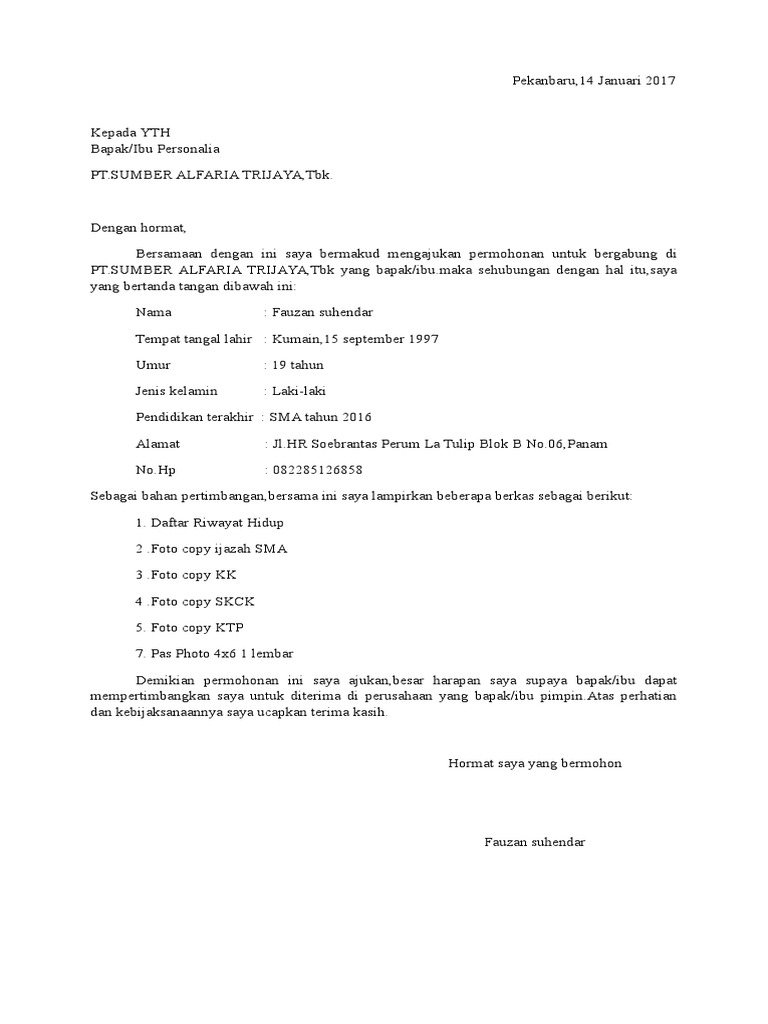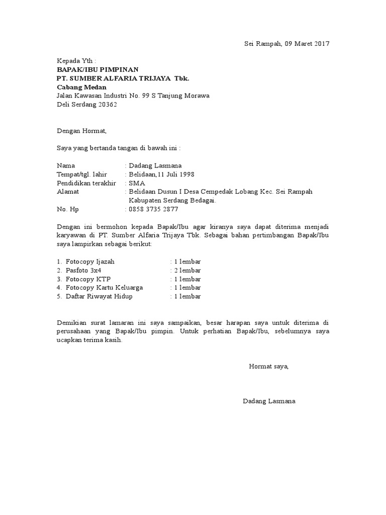 Surat Lamaran Kerja Pt Sumber Alfaria Trijaya Tbk