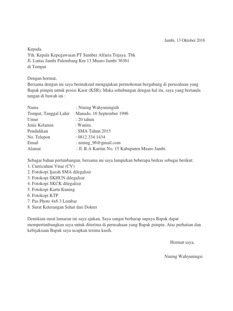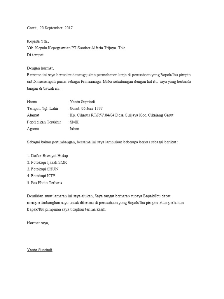 Surat lamaran kerja pt sumber alfaria trijaya tbk. Kantor Pusat Alfamart berada di Tangerang dan memiliki 32 Kantor cabang yang tersebar di seluruh Indonesia. Contoh Surat Lamaran Kerja Alfamart Tulis Tangan. Pria.