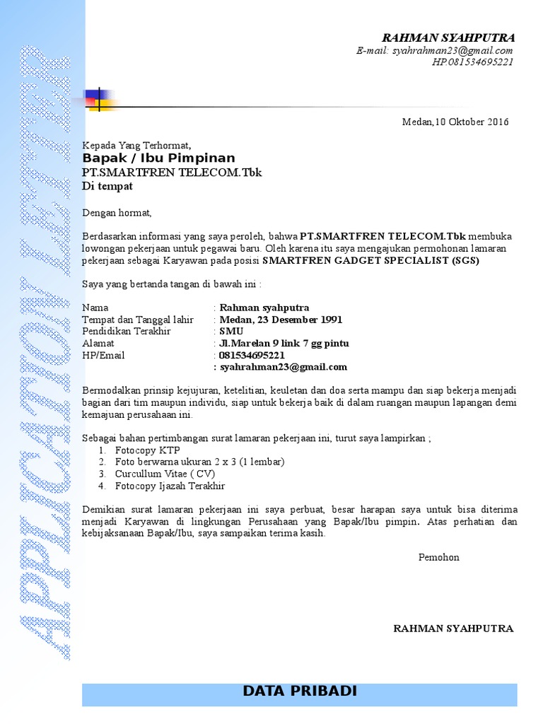 Contoh Surat Lamaran Pt Smartfren Contoh surat lamaran kerja di perusahaan seringkali dicari oleh para pencari kerja yang ingin mengajukan lamaran pekerjaan di perusahaan perusahaan yang ada di indonesia. Mohon waspada apabila ada pihak. Dan juga tercantum pada lamaran atau pun CV anda.