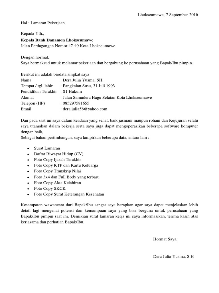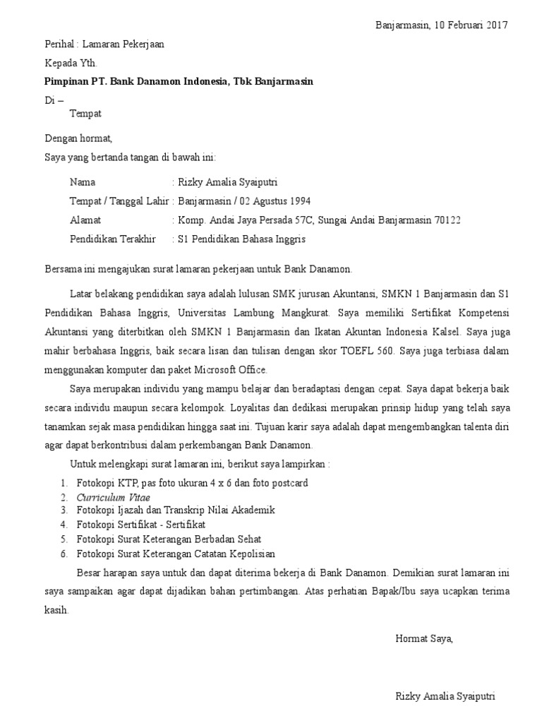 Pasuruan 21 Februari 2019. Anda juga bisa menjelajah galeri gambar Contoh Surat Lamaran Kerja Untuk Di Bank Danamon yang kami telah siapkan untuk mencari gambar yang anda cari. Saya mengirim surat lamaran.
