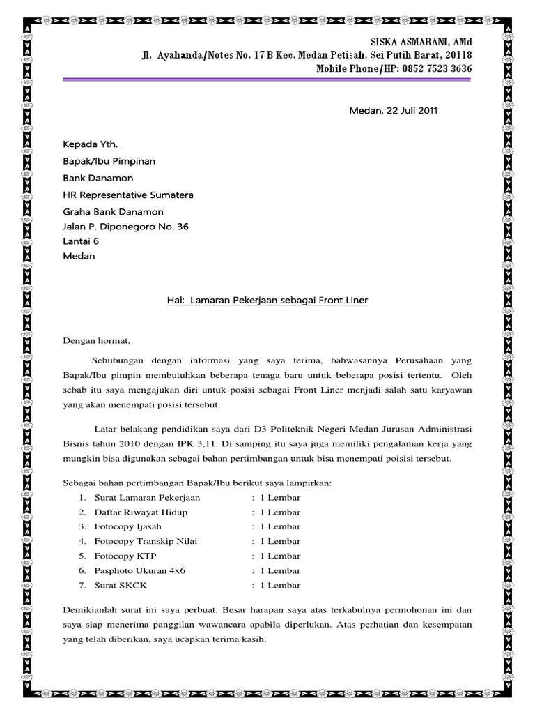 The collection that comprising chosen picture and the best amongst others. Dengan hormat Sehubungan dengan adanya informasi lowongan kerja di Bank Danamon Indonesia KCU Sleman sebagai Teller Frontliner maka dengan ini saya. Contoh surat lamaran kerja di Bank Danamon ini dapat anda gunakan untuk melamar pekerjaan di Bank Danamon yang hampir di seluruh cabang Bank Danamon membutuhkan karyawan untuk ditempatkan di cabang-cabang bank danamon lainnya sehingga tak heran jika banyak orang yang ingin melamar kerja di bagian bank.