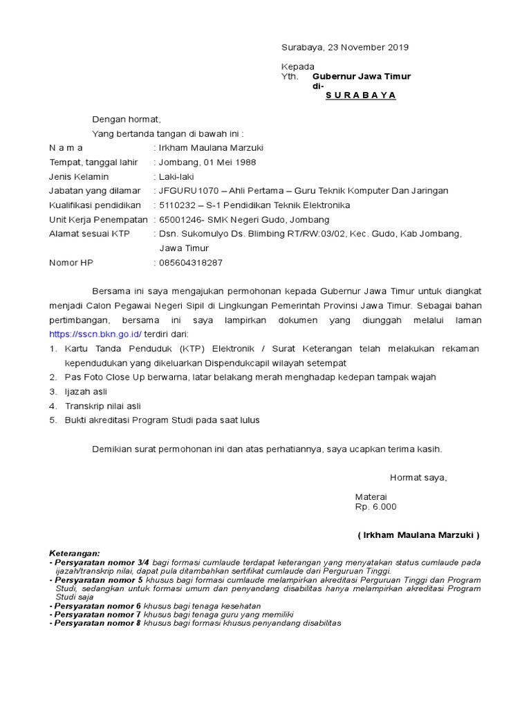 Download contoh surat lamaran untuk CPNS dan PPPK Jawa Timur 2021 lengkap dengan surat keterangan pengalaman disabilitas dan lain-lain. Ahli Pertama Pranata. Surabaya 28 Juli 1997 Jenis Kelamin.