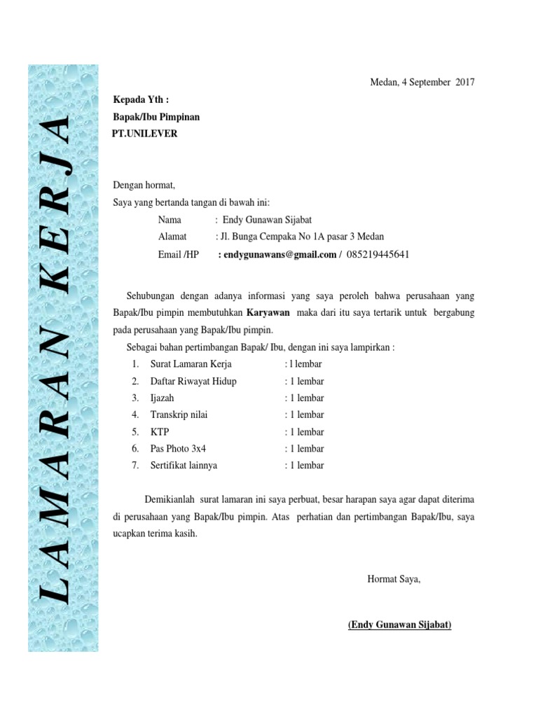 Surat lamaran kerja unilever. Dibawah ini adalah informasi Contoh Surat Lamaran Kerja Pt Unilever. Surat Lamaran Kerja HRD PTUnilever Indonesia Tbk. Jika anda membuat surat lamaran dengan cara ditulis tangan pastikan tulisan anda.