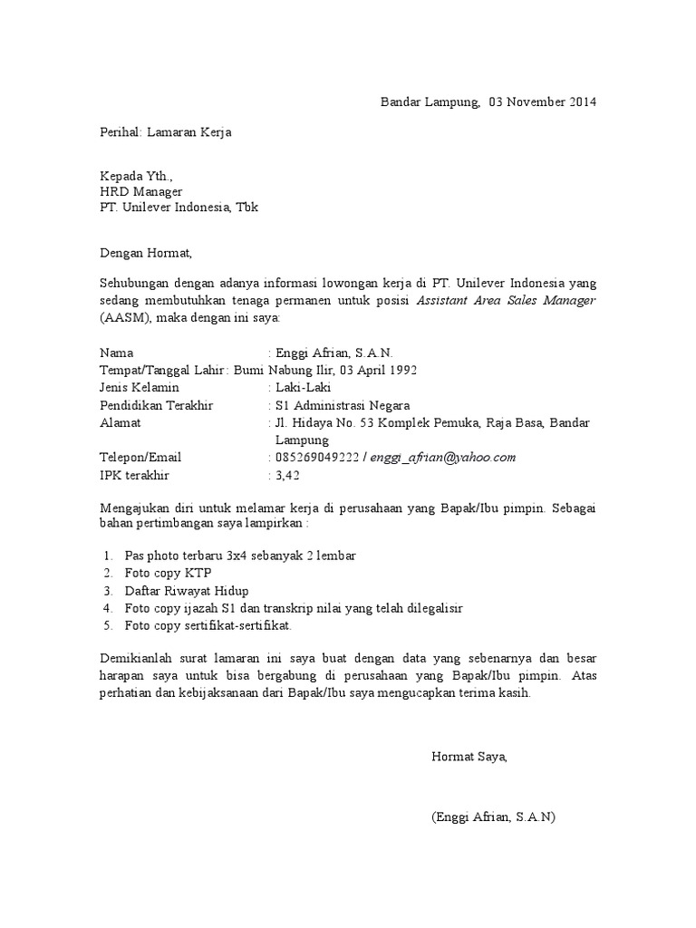 Surat Lamaran Kerja Enggi Afrian Unilever