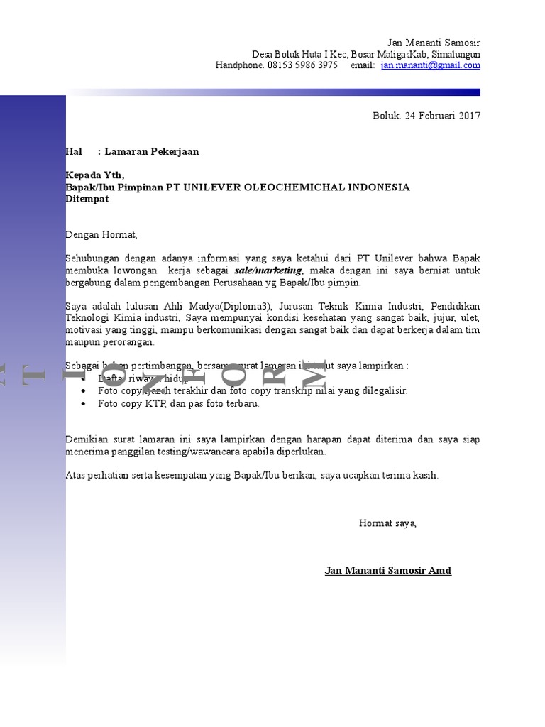 Contoh Surat Lamaran Kerja Ke Pt Unilever Contoh Lif Co Id