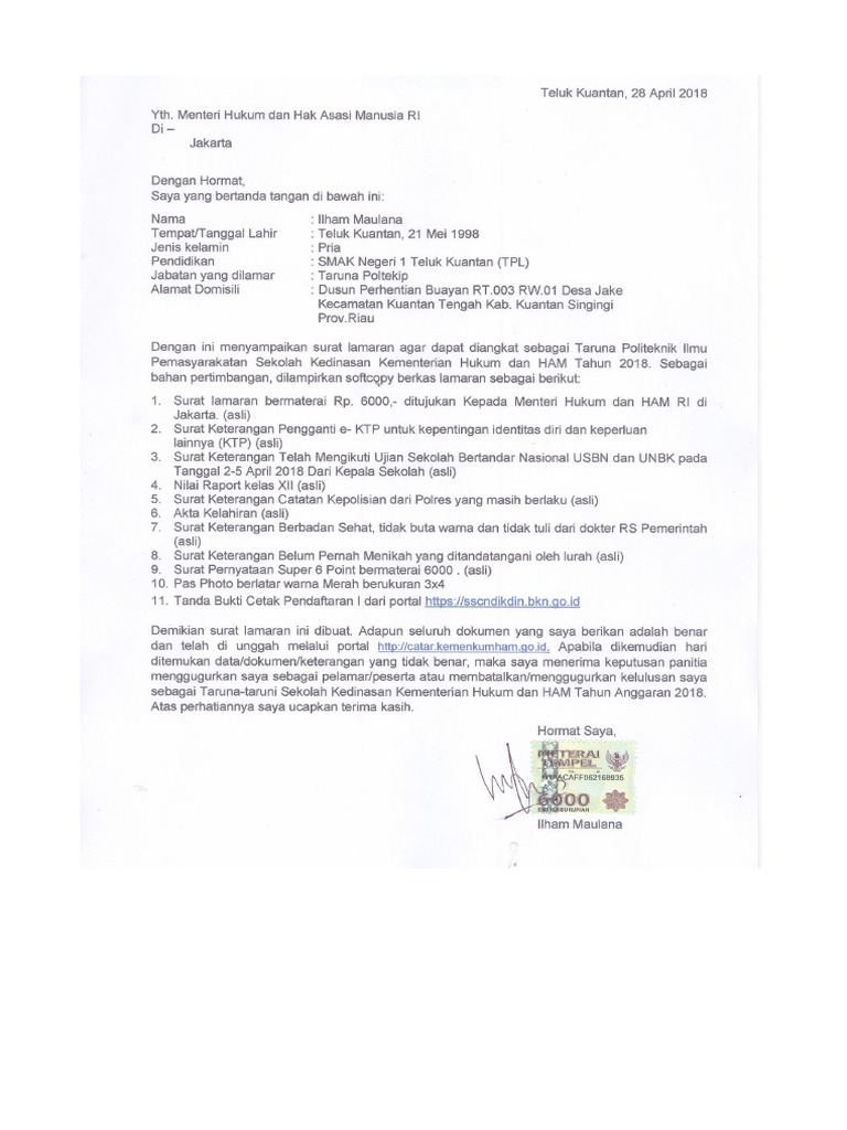 Dengan ini menyampaikan surat lamaran agar dapat diangkat sebagai Taruna Politeknik Ilmu Pemasyarakatan Sekolah Kedinasan Kementerian Hukum dan HAM Tahun 2021. Selain itu untuk mendukung kelancaran dalam proses pendaftaran BKN juga telah melakukan berbagai. Sebagai bahan pertimbangan dilampirkan softcopy berkas lamaran sebagai berikut.